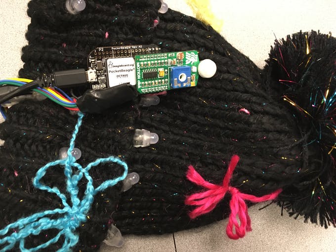 BeagleBoard.org PocketBeagle has great performance along with a tiny size and low cost. It makes a perfect platform for building a wearable electronics project. Ugly Christmas Sweaters and other crazy LED projects are fun to share so we decided to try our hand at Holiday Wearables. Since PocketBeagle’s size is even smaller than Raspberry Pi or other similar boards, we were able to fit our project into a Holiday Hat.