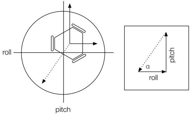The best way to combine the data is by using a Kalman filter. I have tried other kinds of filters and have seen that this one gives the most accurate results. The Kalman filter takes the gyroscope and accelerometer values and calculates the amount of trust each one deserves. It can change the amount of trust while running and gives a much more accurate reading that the complementary filter. Once the pitch and roll are calculated by the Kalman filter the robot takes the arctangent of the two values to find the driving angle.