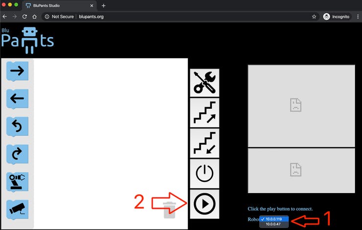On the "Robot" drop-down menu (bottom right), select the WiFi IP address of your Beaglebone and click "Play":