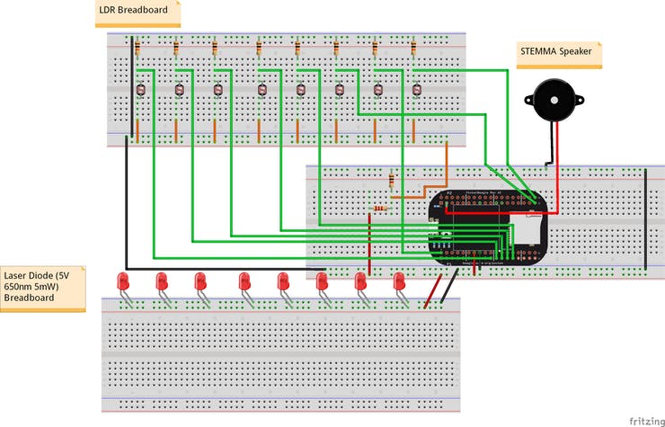 There are four main electronic components: a Pocketbeagle, laser diodes (x8), photoresisters (x8), and a speaker. The speaker is connected to PWM pins and take in signals at 50 % duty and a note-specific frequency. The laser diodes are connected to the 5V pins from the SYS VOUT of the pocketbeagle. The photoresistors take in a voltage signal from the output of a voltage divider (R2 = 2.2K Ω, R1 = 1K Ω) applied to the SYS VOUT. The output of the photoresistors are passed as analog inputs (AIN) into the PocketBeagle. As shown in the Fritzing diagram, three separate breadboards along with jumper wires are used for improved functionality.