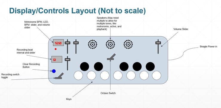 With my basic functions defined, I began planning out the basic UI hardware that I would need to achieve each function. I decided that I would need three speakers, one for playback, one for live sound, and one for the metronome. I would need 12 push buttons for the keys of the synthesizer, and one more to clear the recorded music when a new recording is desired. Additionally, I would need four variable resistors, three for volume control and one for tempo control on the metronome. I also wanted two 4-Digit hex displays as well as an LED for the metronome. With a potential parts list decided upon, I created a mock-up of what the device would look like: