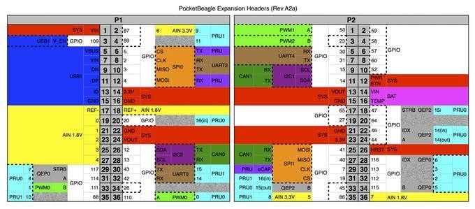 The following figure shows the pin-out of the 2 headers of PocketBeagle®.